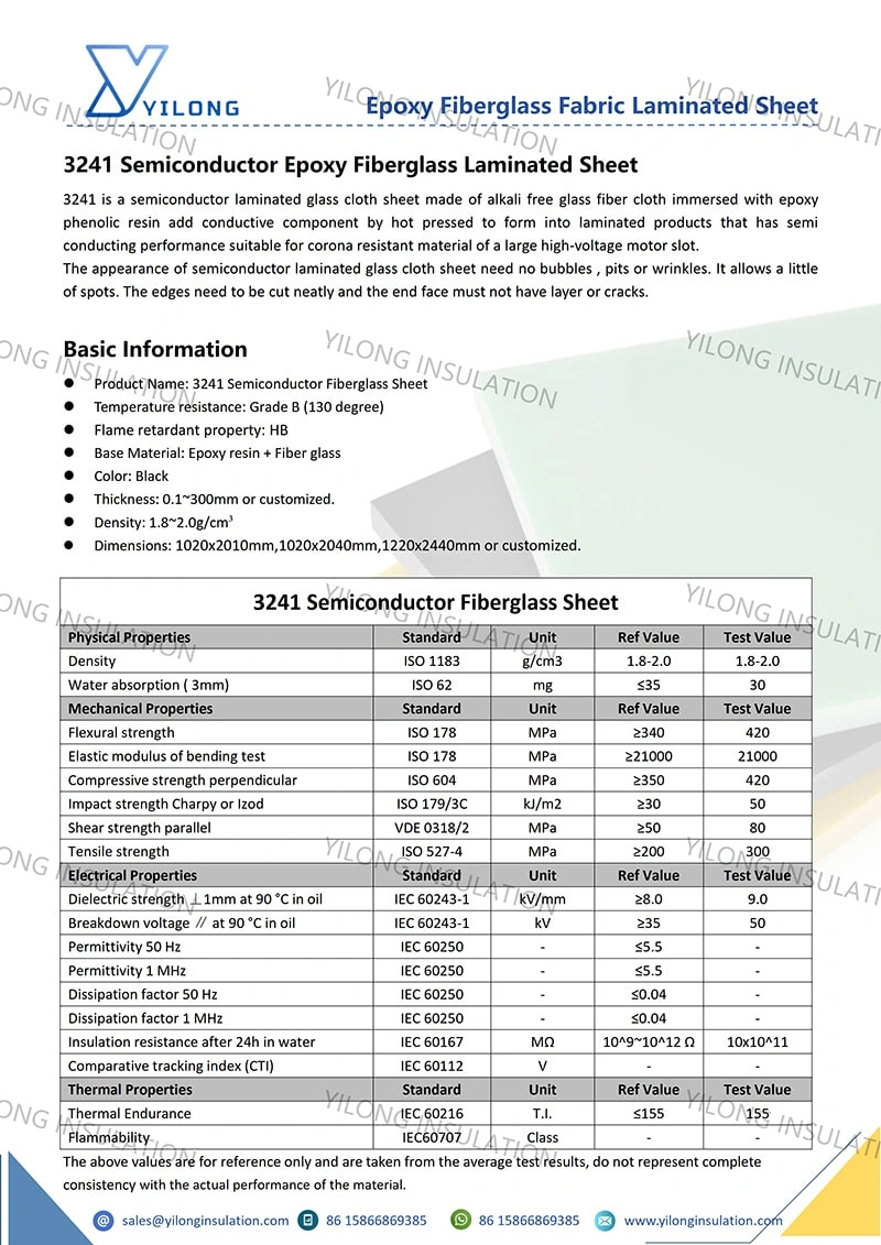 3241 is a semiconductor laminated glass cloth sheet made of alkali free glass fiber cloth immersed with epoxy phenolic resin add conductive component by hot pressed to form into laminated products that has semi conducting performance suitable for corona resistant material of a large high-voltage motor slot.