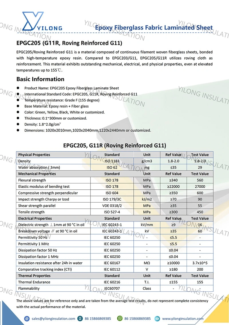 EPGC205/Roving Reinforced G11 is a material composed of continuous filament woven fiberglass sheets, bonded with high-temperature epoxy resin. Compared to EPGC203/G11, EPGC205/G11R utilizes roving cloth as reinforcement. This material exhibits outstanding mechanical, electrical, and physical properties, even at elevated temperatures up to 155℃.