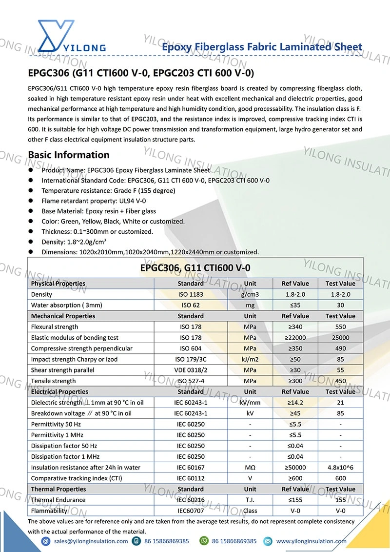 EPGC306/G11 CTI 600 V-0 high temperature epoxy resin fiberglass board is created by compressing fiberglass cloth, soaked in high temperature resistant epoxy resin under heat with excellent mechanical and dielectric properties, good mechanical performance at high temperature and high humidity condition, and good processability. The insulation class is H class. Its performance is similar to that of EPGC203, and the resistance index is improved, compressive tracking index CTI is 600. It is suitable for high voltage DC power transmission and transformation equipment, large hydro generator set and other F class electrical equipment insulation structure parts.