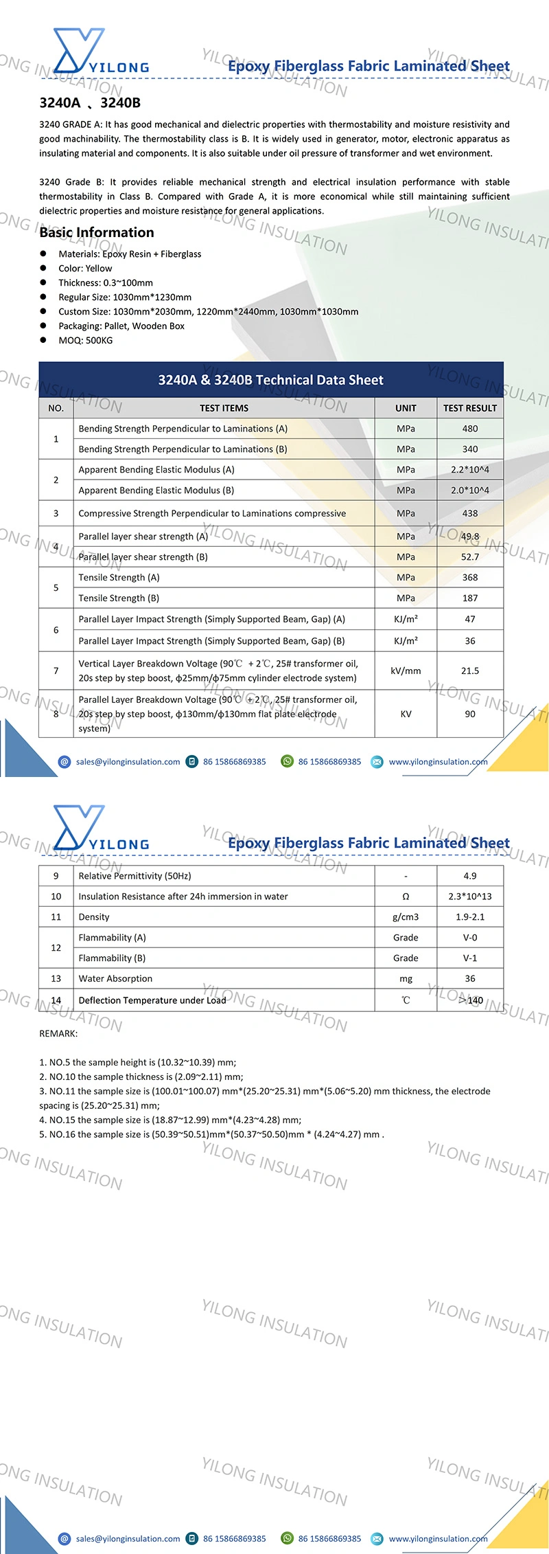 3240 Epoxy Phenolic Glass Cloth Laminated Sheet is made of electrical-grade alkali-free glass fiber cloth impregnated with modified epoxy phenolic resin, and produced by hot pressing and curing. 3240 GRADE A: It has good mechanical and dielectric properties with thermostability and moisture resistivity and good machinability. The thermostability class is B. It is widely used in generator, motor, electronic apparatus as insulating material and components. It is also suitable under oil pressure of transformer and wet environment. 3240 Grade B: It provides reliable mechanical strength and electrical insulation performance with stable thermostability in Class B. Compared with Grade A, it is more economical while still maintaining sufficient dielectric properties and moisture resistance for general applications.