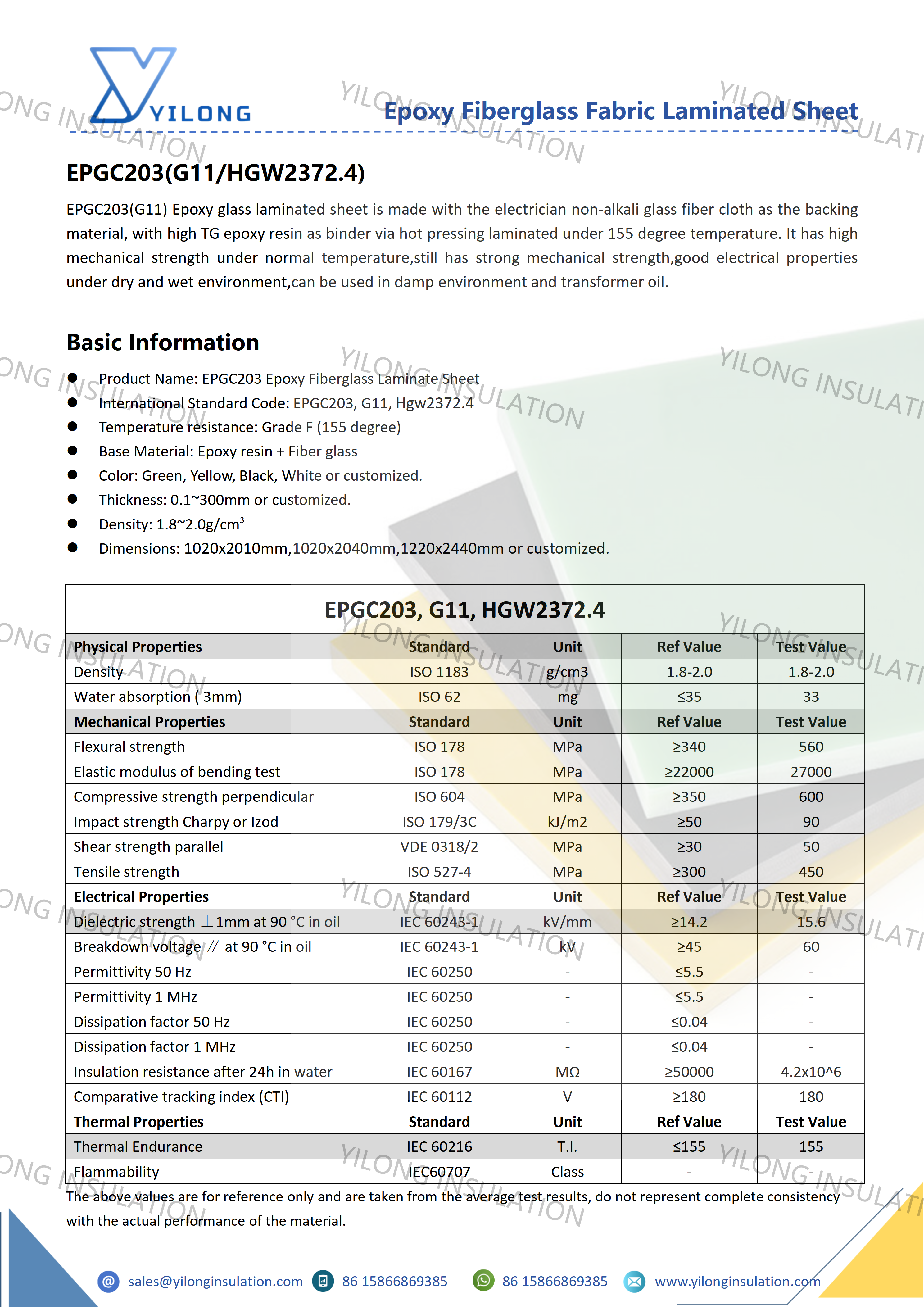 EPGC203(G11) Epoxy glass laminated sheet is made with the electrician non-alkali glass fiber cloth as the backing material, with high TG epoxy resin as binder via hot pressing laminated under 155 degree temperature. It has high mechanical strength under normal temperature,still has strong mechanical strength,good electrical properties under dry and wet environment,can be used in damp environment and transformer oil. It belongs to grade F heat resistance insulating material.