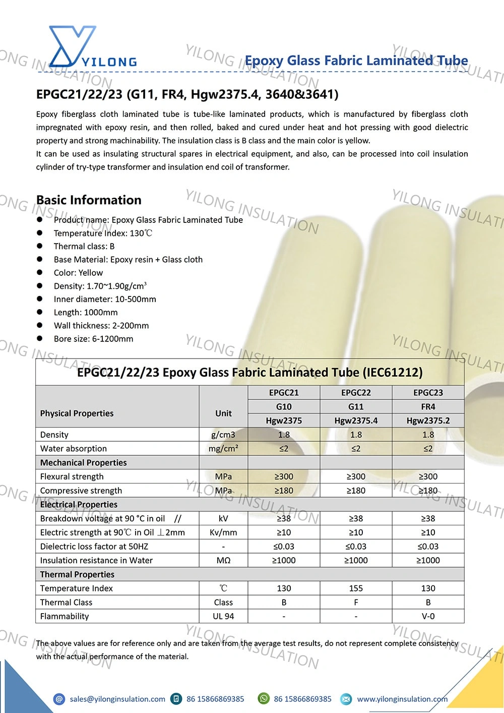 Epoxy fiberglass cloth laminated tube is tube-like laminated products, which is manufactured by fiberglass cloth impregnated with epoxy resin, and then rolled, baked and cured under heat and hot pressing with good dielectric property and strong machinability. The insulation class is B class and the main color is yellow.
