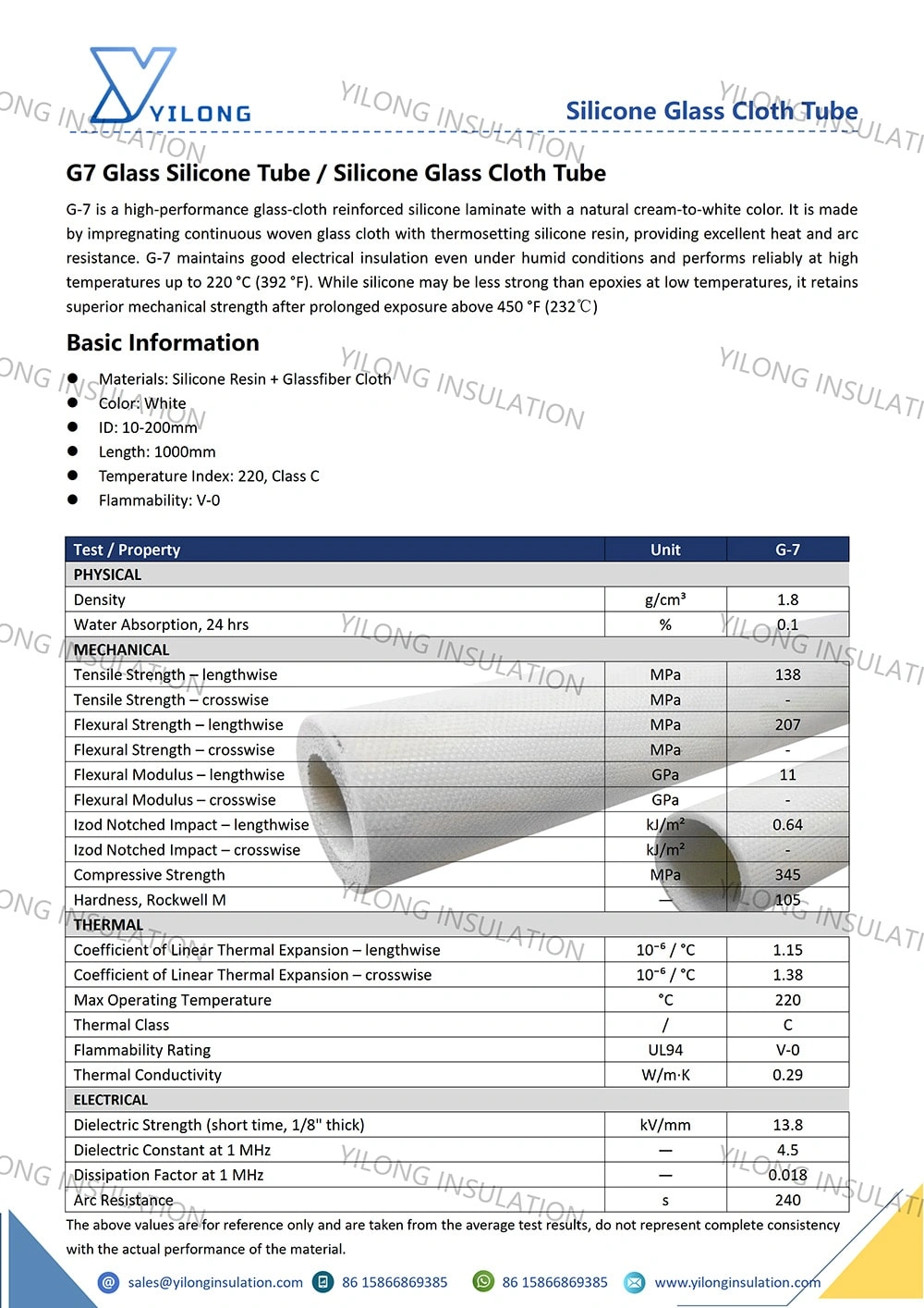 G-7 is a high-performance glass-cloth reinforced silicone laminate with a natural cream-to-white color. It is made by impregnating continuous woven glass cloth with thermosetting silicone resin, providing excellent heat and arc resistance. G-7 maintains good electrical insulation even under humid conditions and performs reliably at high temperatures up to 220 °C (392 °F). While silicone may be less strong than epoxies at low temperatures, it retains superior mechanical strength after prolonged exposure above 450 °F (232℃)