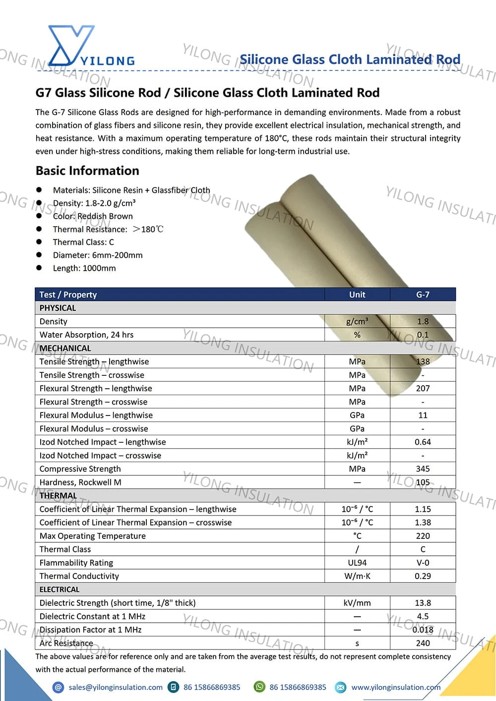 The G-7 Silicone Glass Rods are designed for high-performance in demanding environments. Made from a robust combination of glass fibers and silicone resin, they provide excellent electrical insulation, mechanical strength, and heat resistance. With a maximum operating temperature of 180°C, these rods maintain their structural integrity even under high-stress conditions, making them reliable for long-term industrial use.